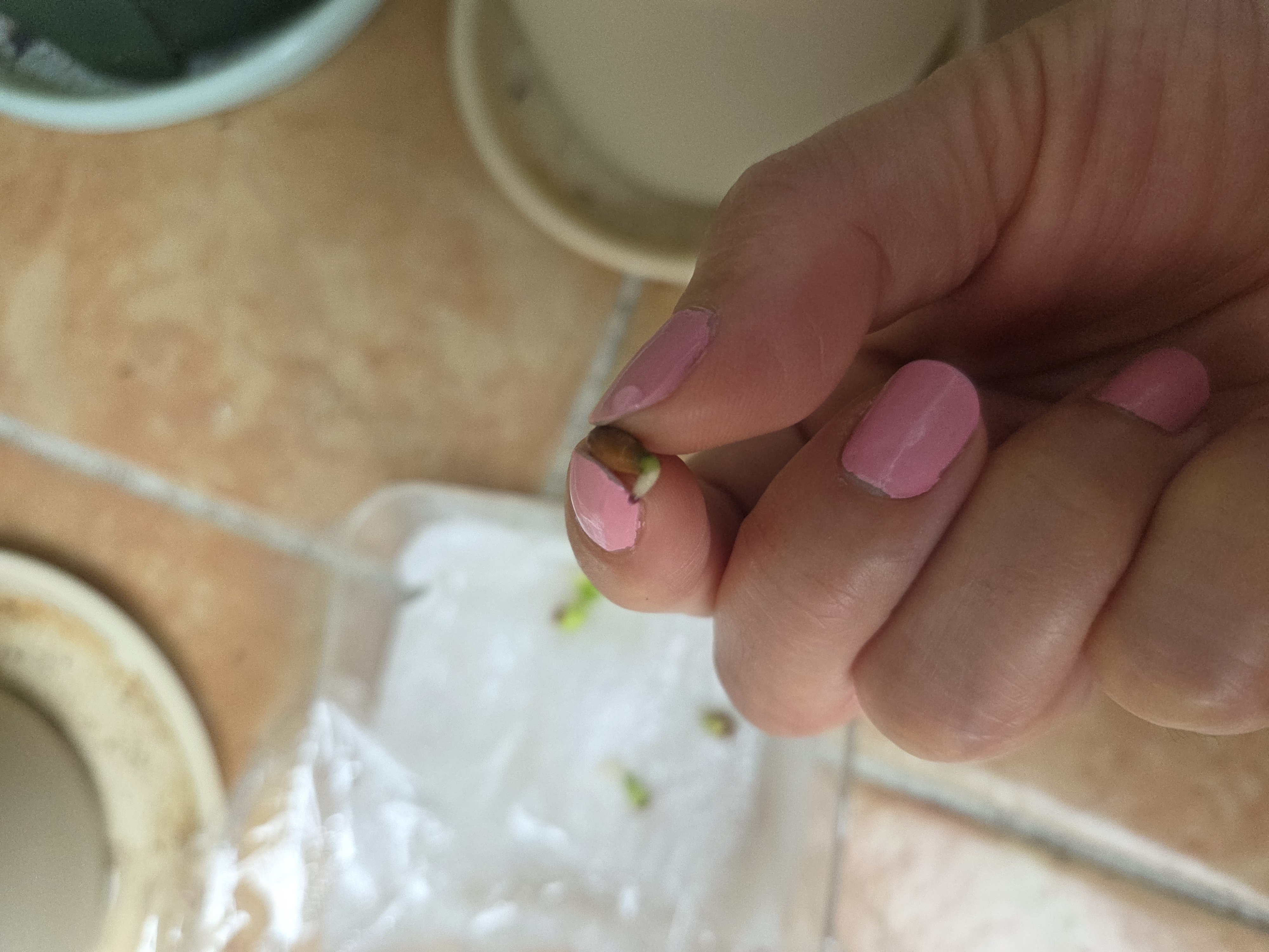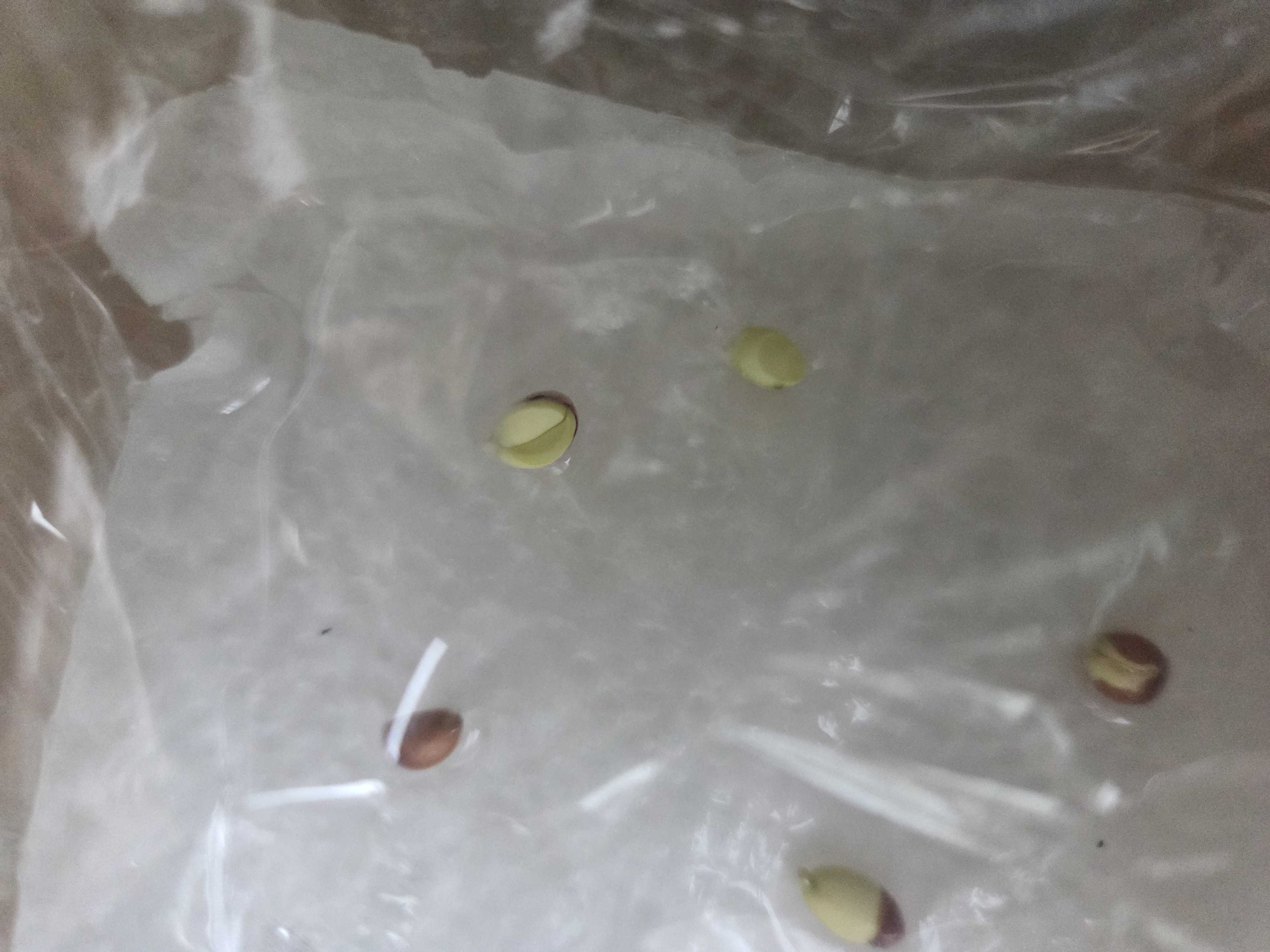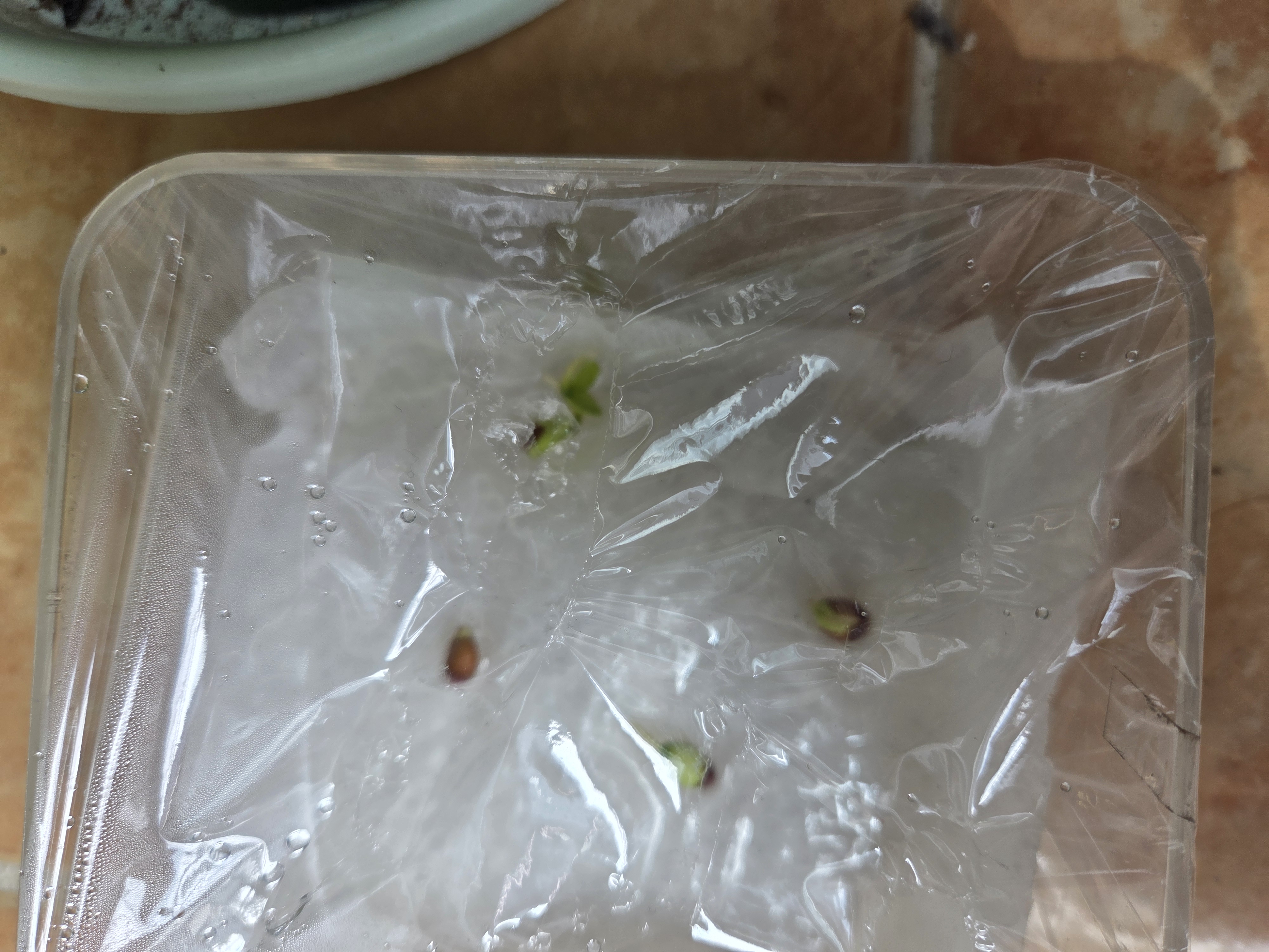 갈색의 얇은 껍질이 또 나오고 이 껍질마저 살짝 까주고투명한 그릇에 키친타올 깔고 물 넣어주고 씨앗도 넣어준다!