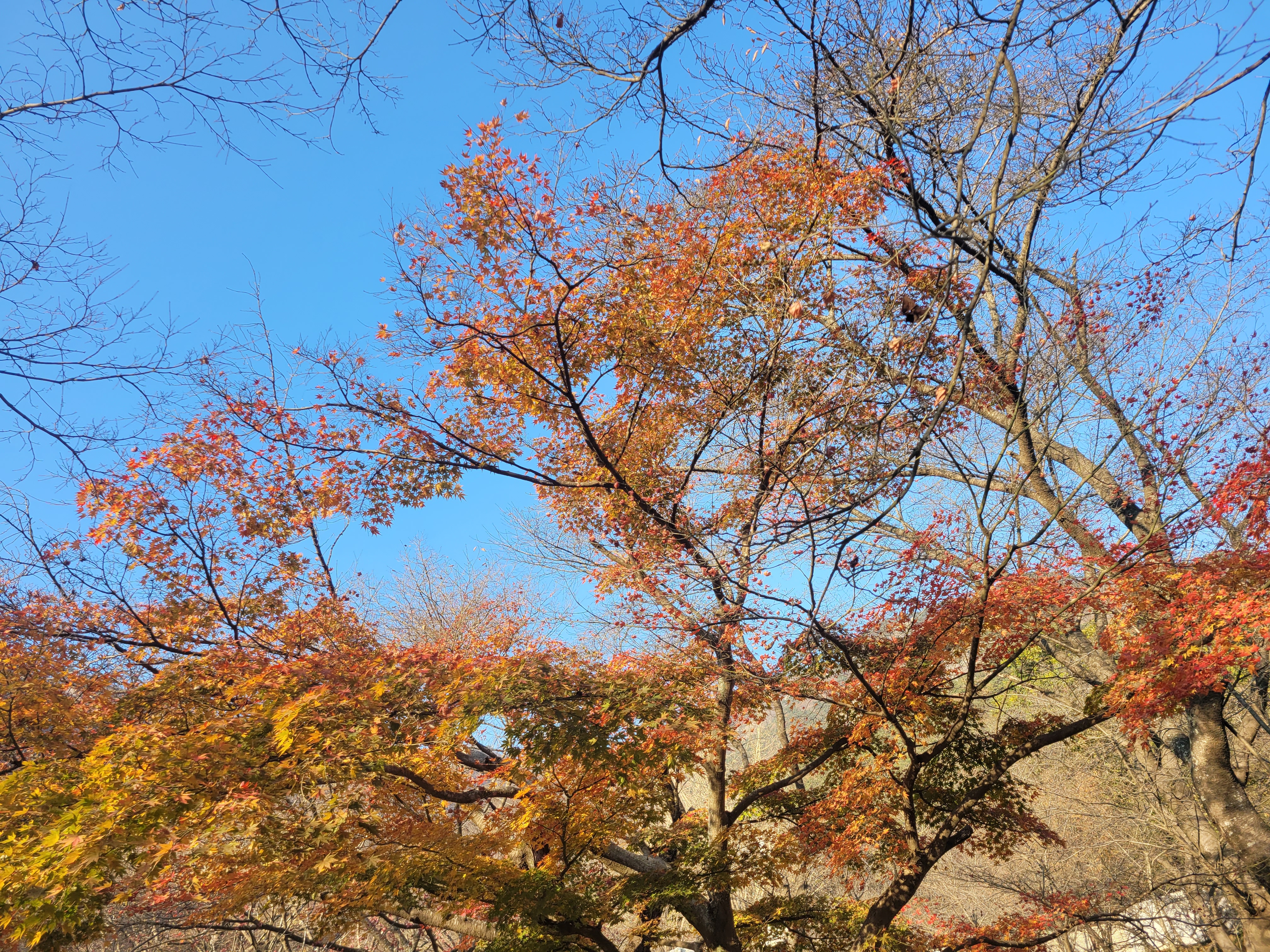 어라~ 아직도 버티고 남아있는 단풍나무들이 보인다.